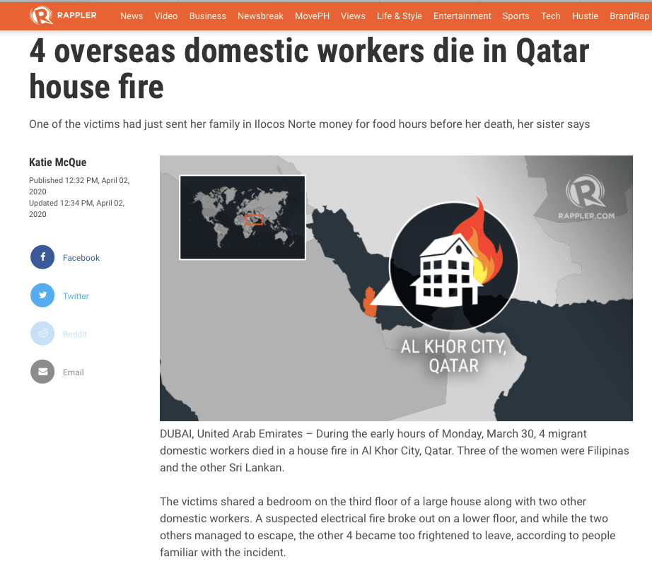 DUBAI, United Arab Emirates – During the early hours of Monday, March 30, 4 migrant domestic workers died in a house fire in Al Khor City, Qatar. Three of the women were Filipinas and the other Sri Lankan.