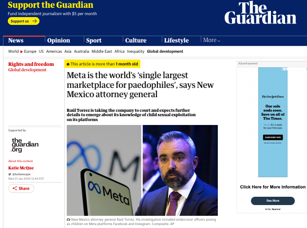 Read full article here: https://www.theguardian.com/global-development/2024/jan/31/meta-worlds-single-largest-marketplace-for-paedophiles-new-mexico-attorney-general-facebook-instagram