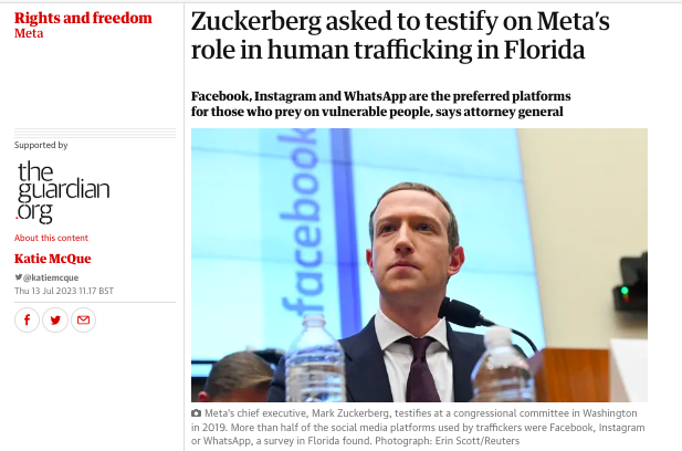 Read the full story here: https://www.theguardian.com/global-development/2023/jul/13/zuckerberg-asked-testify-meta-facebook-instagram-whatsapp-role-human-trafficking-florida