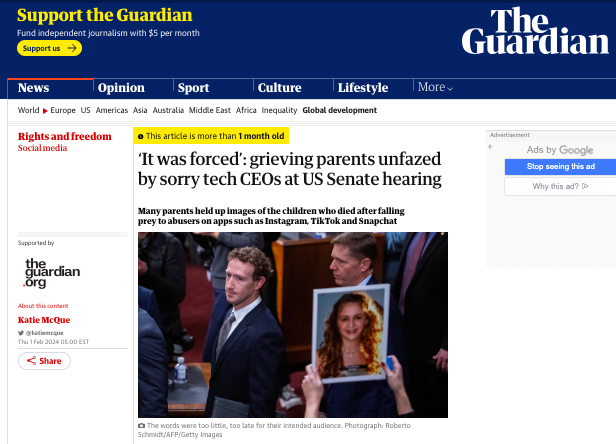 Read full article here: https://www.theguardian.com/media/2024/feb/01/parents-tech-ceos-us-senate-hearing