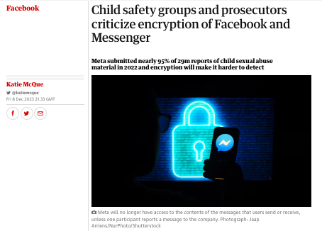 Read full story here: https://www.theguardian.com/technology/2023/dec/08/facebook-messenger-encryption-child-sexual-abuse