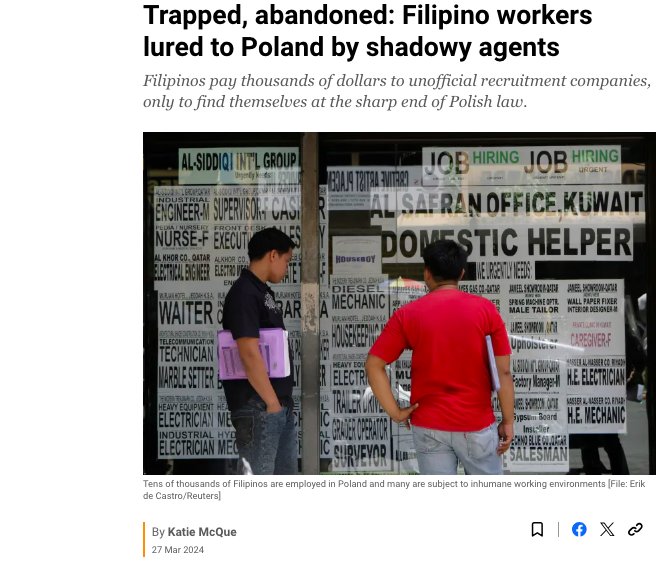 Link to article: https://www.aljazeera.com/features/2024/3/27/trapped-abandoned-filipino-workers-lured-to-poland-by-shadowy-agents