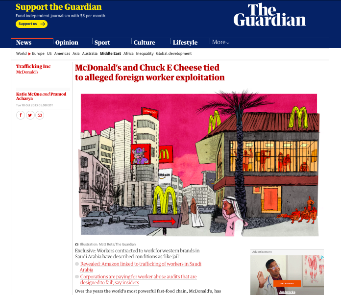 Read full investigation here: https://www.theguardian.com/business/2023/oct/10/mcdonalds-trafficking-links-claims-chuck-e-cheese-saudi-arabia