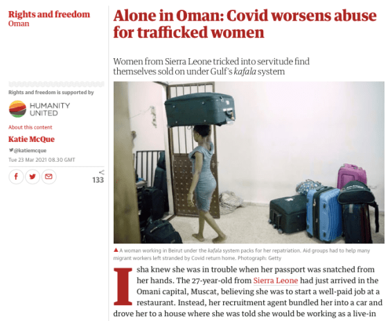 The Guardian: Alone in Oman: Covid worsens abuse for trafficked women