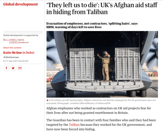 The Guardian: ‘They left us to die’: UK’s Afghan aid staff in hiding from Taliban