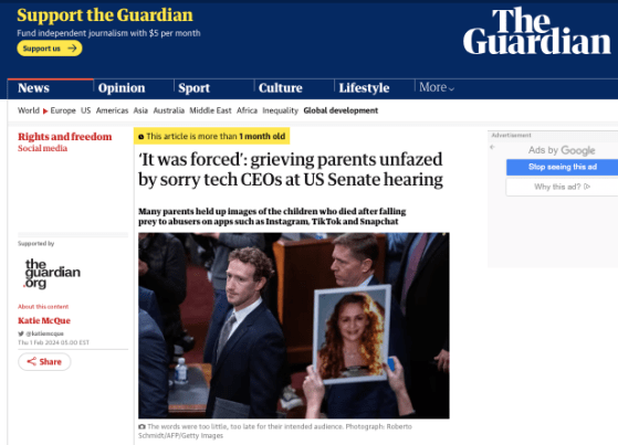 The Guardian: ‘It was forced’: grieving parents unfazed by sorry tech CEOs at US Senate hearing