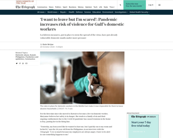 The Telegraph: ‘I want to leave but I’m scared’: Pandemic increases risk of violence for Gulf’s domestic workers