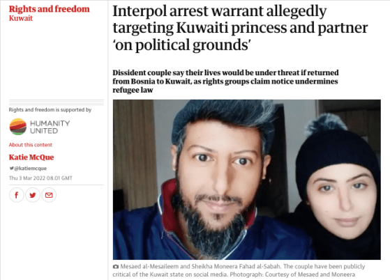 The Guardian: Interpol arrest warrant allegedly targeting Kuwaiti princess and partner ‘on political grounds’