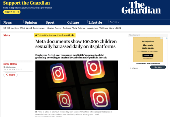 The Guardian: Meta documents show 100,000 children sexually harassed daily on its platforms